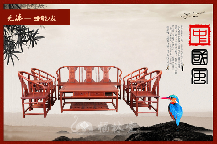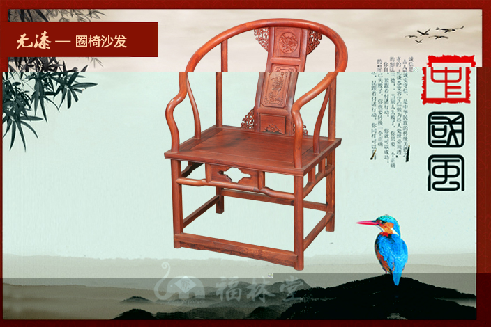圈椅,因椅圈恰似羅圈,民間又稱“羅圈椅”或“圓椅”,圈椅的造型上圓下方,外圓內(nèi)方,這暗和了中國(guó)傳統(tǒng)文化中的乾坤之說,乾為天為圓,坤為地為方,而外圓內(nèi)方則是中國(guó)傳統(tǒng)文化中所崇尚的一種品德,雖在處事上有所圓滑但卻內(nèi)在有所堅(jiān)持。它最明顯的特征則是在圈背上連結(jié)著扶手,從高到低一順而下,座靠時(shí)可使人的臂膀都倚著圈形的扶手,感到十分舒適,頗受人們喜愛!