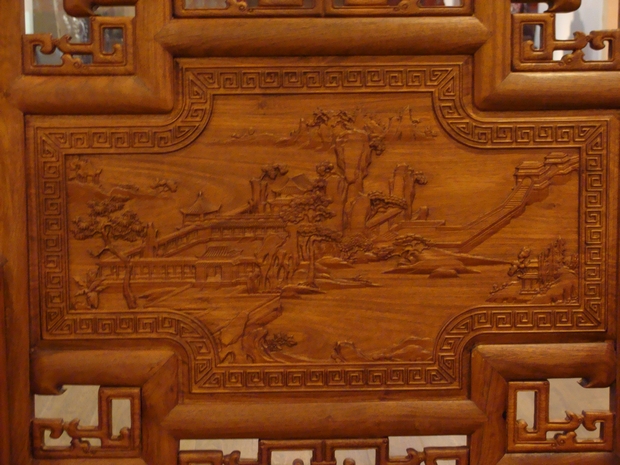 最后,再重點說說扶手內(nèi)外兩側(cè)處的紋飾圖案部分,同樣如上方“松柏庭宇云海圖”給人的第一感覺一樣,該處畫案整體之風(fēng)格偏重山水文人畫一類,依舊是挺拔筆直的松樹,閑庭屹立的庭宇,還有那可以倚照著波光漣漪的湖水,感受到的那悉簌搖擺的徐徐的微風(fēng),飄蕩在這靜怡的湖面之上。一座有著扶手的欄倚小橋駕于在湖面上,連接著湖岸兩端,幾處矮實的小戶瓦樓簇居而座,整體畫面給人一種“小橋流水人家”的彎延意境美,綿延厚絕。
