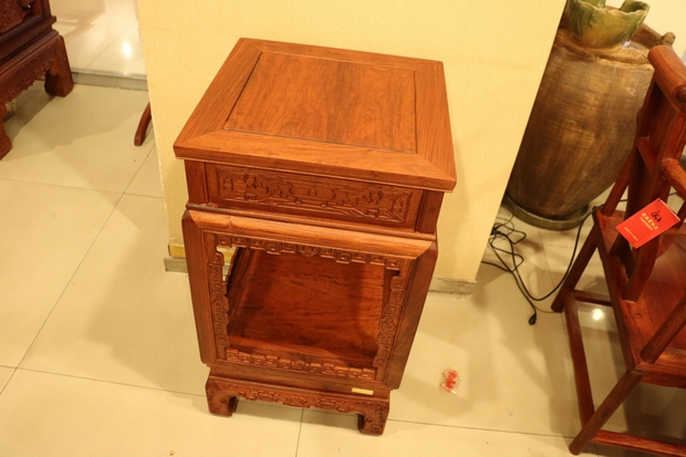 在其長板下方,沙發靠背板的正面正中間,有一正方形的框架,內飾有幾處古物器件:一沉香爐中的香火裊裊飄著余煙,彎流而去;而其左側豎立著的則是一高高的壺器,壺器內插有幾株清新的草木枝葉,透著自然的清香;器壺之下的左側則為一盞古制的吊嘴酒壺,可以想象里面盛滿著美酒,飄著淡淡酒香,美好而向往;酒壺之下斜放著一柄亮直的寶劍,優雅略帶江湖之意。而在其靠背板反面的框架位置,則刻畫了葫蘆、荷花等圖案,也多以表示其吉祥福到之意。縱觀框架整體畫案的風格,透出一股濃濃的中國風氣息,其寶劍和美酒相配,香爐與清野相間,寶葫與荷花相偎,風格完整一致,古樸自然,寄托了人們向往自由平淡生活,寄托于山水的閑情雅致情調,這也與該系列"福"字的主題相契合,柔中帶美,古而不艷,顯得地十分鮮活形象,古樸而沉韻。