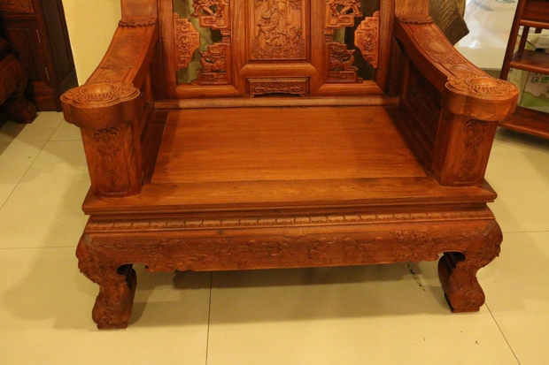 然后是沙發的座面,溫潤細實,經燙蠟工藝處理后的緬花木面更帶有一種淡淡地透亮光澤,古香古韻。再在下方位置,束腰及牙條部分同樣還有幾些人物、花草、幾何紋飾以及祥云之浮雕雕刻,給人以一種如履仙境之感,藝術畫面感極為強烈!