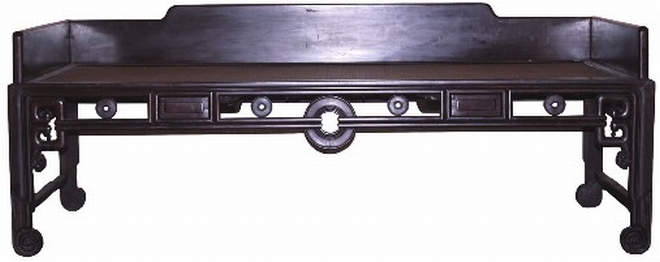 榻為紅木制,三塊光素的獨板做圍子,無束腰,攢框裝藤編軟屜為芯,直腿卷云紋。牙條正中為大銅錢紋飾,兩邊對稱嵌銅錢卡子花,榻兩側安羅鍋棖。